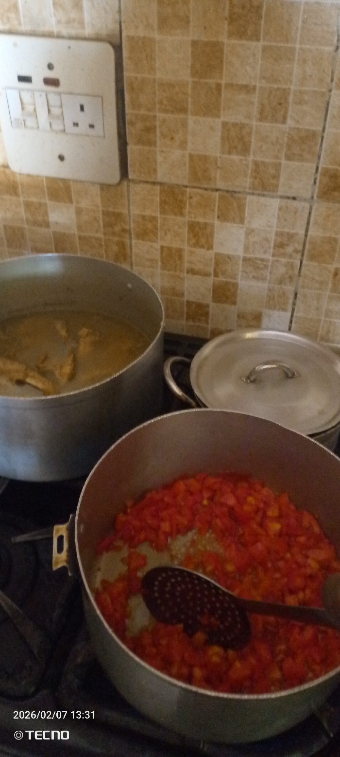 The scene depicts a kitchen interior in Katon Rikkos, Nigeria, as photographed on February 7, 2026, at 13:31. No individuals are visible. The background consists of a wall clad in light brown and beige checkered tiles. Mounted on this tiled wall is an off-white electrical faceplate containing multiple light switches and a single three-pin power outlet. In the foreground, three aluminum cooking pots are positioned on a dark stovetop. The large pot on the left contains a light brown broth with several pieces of submerged cooked meat or poultry. The pot in the central foreground contains a quantity of finely diced red tomatoes, appearing to be sautéed, with a black slotted spoon resting within the contents. A third, smaller aluminum pot with a lid is partially visible behind the tomato-filled pot. The image was captured with a TECNO device.
