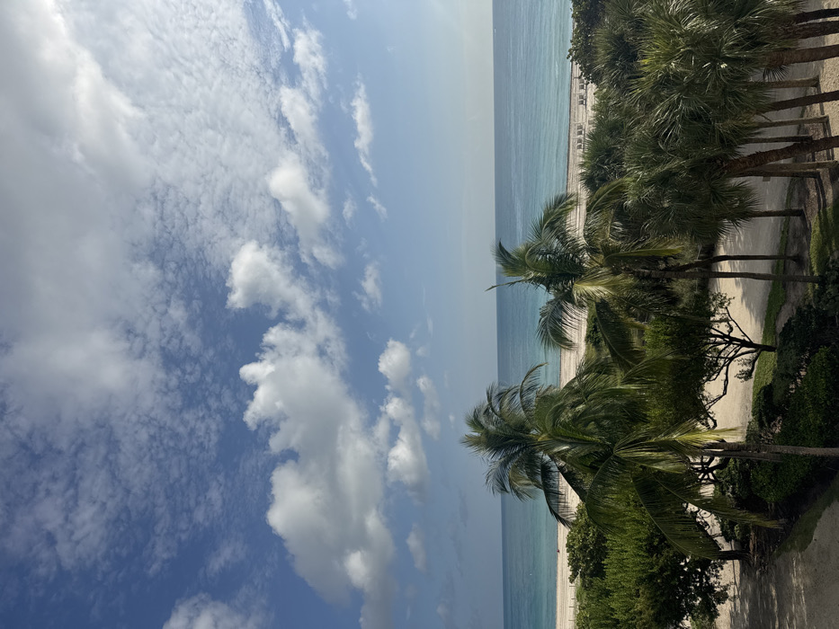The image presents an elevated view of a coastal scene in Surfside, United States, under a partly cloudy sky. The upper portion shows a clear blue sky interspersed with numerous white cumulus and cirrocumulus clouds. Below, the calm Atlantic Ocean stretches to the horizon, displaying shades of turquoise and light blue. A wide, light-colored sand beach separates the ocean from the vegetated foreground. On the beach, specifically towards the right side, multiple white lounge chairs and several beach umbrellas are arranged. The foreground is densely covered with various types of green vegetation, including numerous palm trees of differing heights and species, such as tall, slender coconut palms and shorter, broader palmetto-like palms. Other green shrubs and trees form a thick buffer. A sandy path is visible winding through the lower-left portion of the vegetation. No individuals or specific actions are discernible within the scene.