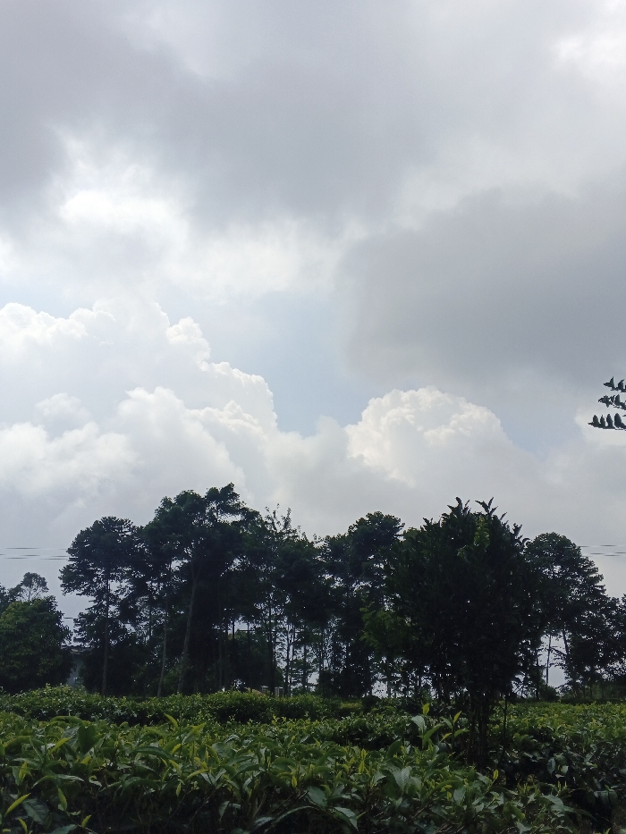 The image displays a landscape located in Koipa, Papua New Guinea. The foreground is composed of a dense, uniform field of green, leafy plants consistent with a cultivated tea plantation. In the midground, a line of tall, dark green trees, appearing to be a mix of conifers and broadleaf species, forms a visual boundary behind the plantation. Faint horizontal lines, likely utility wires, are visible across the upper canopy of these trees. The sky occupies the upper two-thirds of the frame, characterized by a predominantly overcast condition with large, white cumulus clouds interspersed with areas of darker grey clouds. A small section of lighter blue sky is visible towards the upper left. No individuals or specific activities are present in the scene.