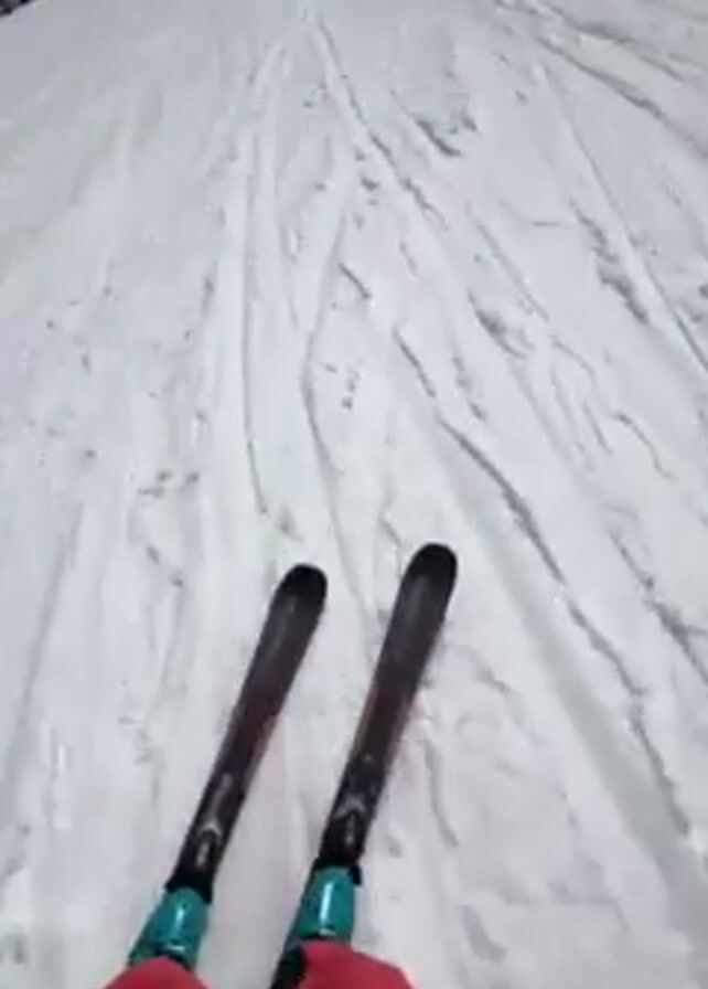 first-person perspective of someone skiing down a snowy slope on a sunny day