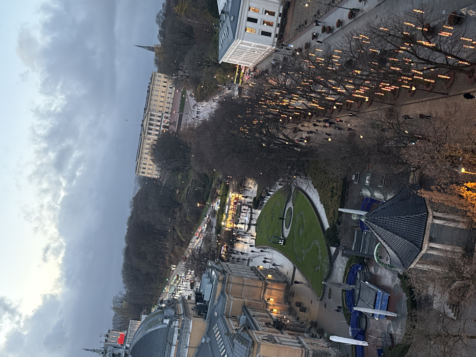 An elevated, oblique view depicts a section of central Oslo, Norway, under an overcast sky, indicating late afternoon or early evening. The ground surfaces, including streets and walkways, appear damp from precipitation. In the background, the Royal Palace, a light-yellow neoclassical structure, stands prominently atop a rise, displaying a flag from its roof. A pointed spire from a distant building is visible to its right. The path leading to the palace is populated by pedestrians. The mid-ground features Karl Johans gate, a wide thoroughfare, running diagonally. Its numerous bare trees are illuminated with vertical strings of warm-toned lights. Many pedestrians are observed walking along this avenue. Adjacent to Karl Johans gate, on the left, is Spikersuppa/Students' Grove, a park area containing a large, crescent-shaped green lawn and a circular fountain or water feature, also traversed by multiple pedestrians. To the left of the scene, the National Theatre, a classical building with a distinct domed roof, is visible. A partial red sign, reading "MAX," is mounted on a structure atop the theatre. A street bordering the theatre carries moderate vehicle traffic, including cars and a bus, with their lights active. In the bottom-left foreground, a dark-roofed gazebo with white columns is present, surrounded by temporary market or event structures featuring blue and white coverings. On the right side of the image, a multi-story, light-colored building with illuminated windows lines Karl Johans gate, with a yellow bus positioned on the adjacent street.