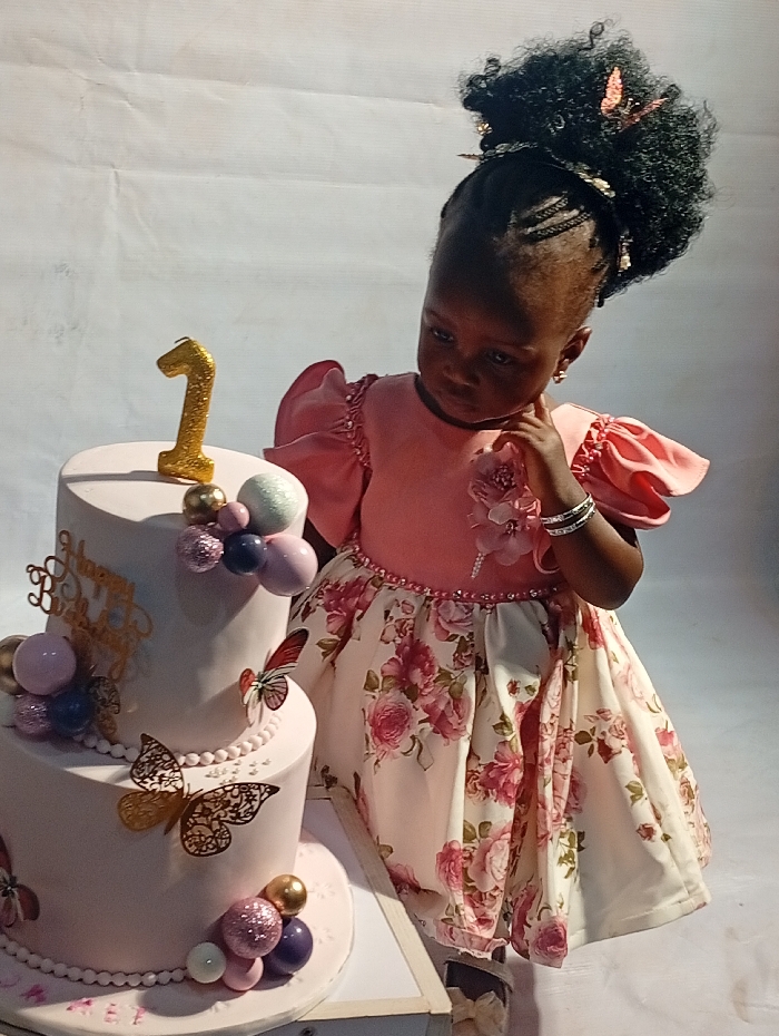 A young child stands next to a two-tier light pink birthday cake in Barakin Akawo, Nigeria. The child, with dark skin, wears a festive dress featuring a pink bodice with puffed sleeves and a floral appliqué, combined with a cream-colored skirt patterned with pink roses. Her hair is styled in braids leading to a high afro puff adorned with small golden butterfly clips. She has silver bracelets on her left wrist. Her gaze is directed downwards towards the cake, with her left hand resting near her chin. The cake is decorated with a golden number "1" candle on the top tier, gold "Happy Birthday" lettering, gold and red butterfly cutouts, white pearl-like bead borders, and spherical ornaments in shades of pink, purple, white, and gold. The cake rests on a white board. The background is a plain, creased light-colored sheet.