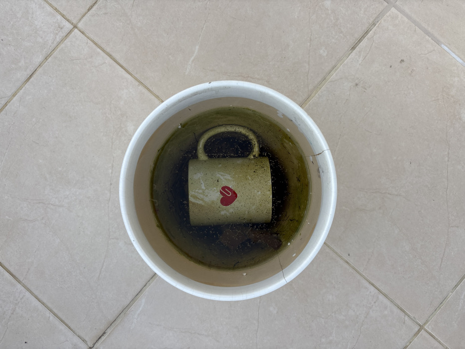 An overhead photographic image depicts a white, cylindrical bucket situated on a beige tiled surface in Tel-Aviv, Israel. The bucket contains an opaque, dark olive-green liquid with visible particulate matter and fibrous debris, consistent with stagnant water and organic growth. A light-tan or pale-green ceramic mug is horizontally submerged within the liquid, displaying a red heart emblem with an integrated paperclip design on its outward-facing side. Numerous small air bubbles are affixed to the mug's surface. The bucket's interior shows discoloration, and a visible hairline crack extends from the top rim downwards on the lower left side. The surrounding floor is composed of uniform square tiles with light grout lines, exhibiting minor surface dirt.