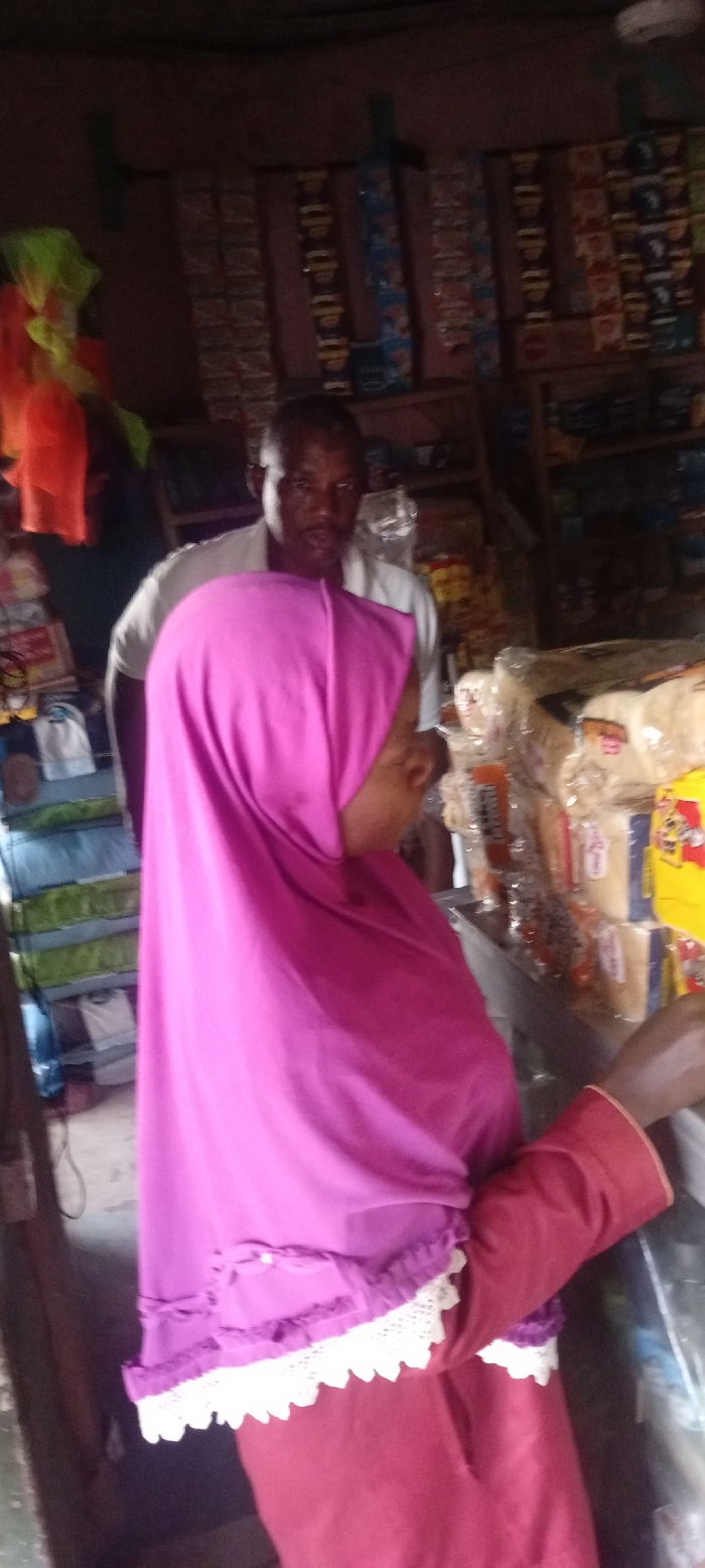 The scene depicts the interior of a small retail establishment, identified as a provision shop in Kwachiri, Nigeria