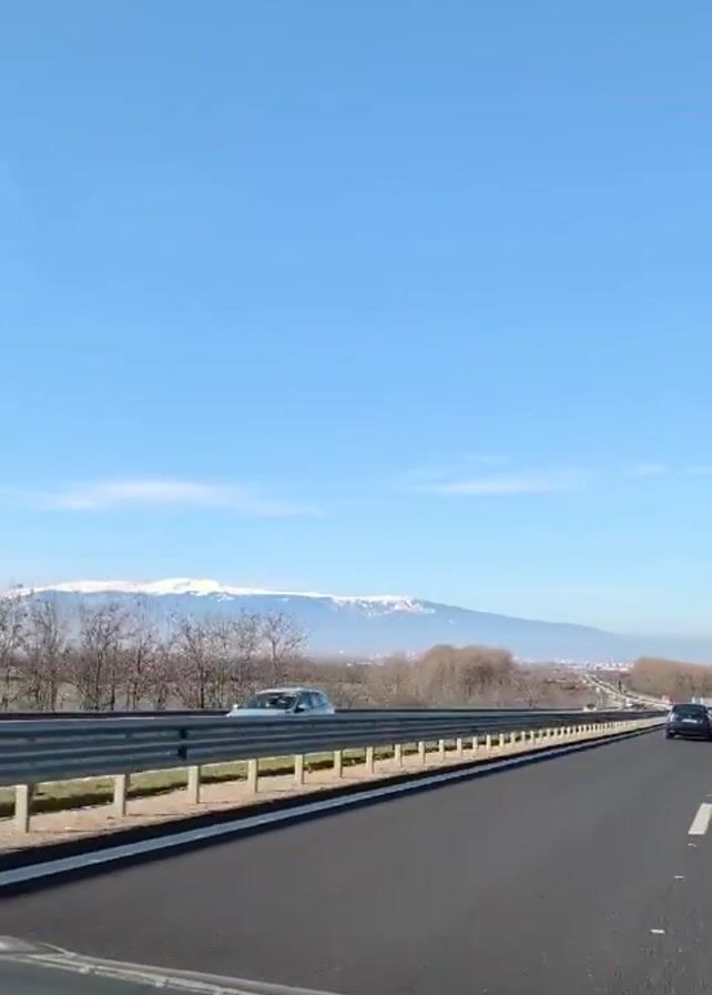 vehicle driving on a highway on a clear day with a bright blue sky. Snow-capped mountains are visible in the distance. Other cars are driving on the highway in the same direction. There is a guardrail on the left side of the road. Trees and fields can be seen beyond the guardrail. The camera is positioned inside the car, capturing the view through the windshield.