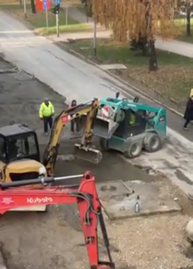 road construction work in progress. There are three construction vehicles visible: a red Kubota excavator, a yellow mini excavator, and a green skid steer loader. Several workers wearing high-visibility vests are directing the operation. One worker is using a shovel near a manhole cover. The skid steer loader is loading material into its bucket, and the mini excavator is preparing the ground. The scene is an urban environment with trees, a street, and a traffic light visible in the background. The weather appears to be overcast.
