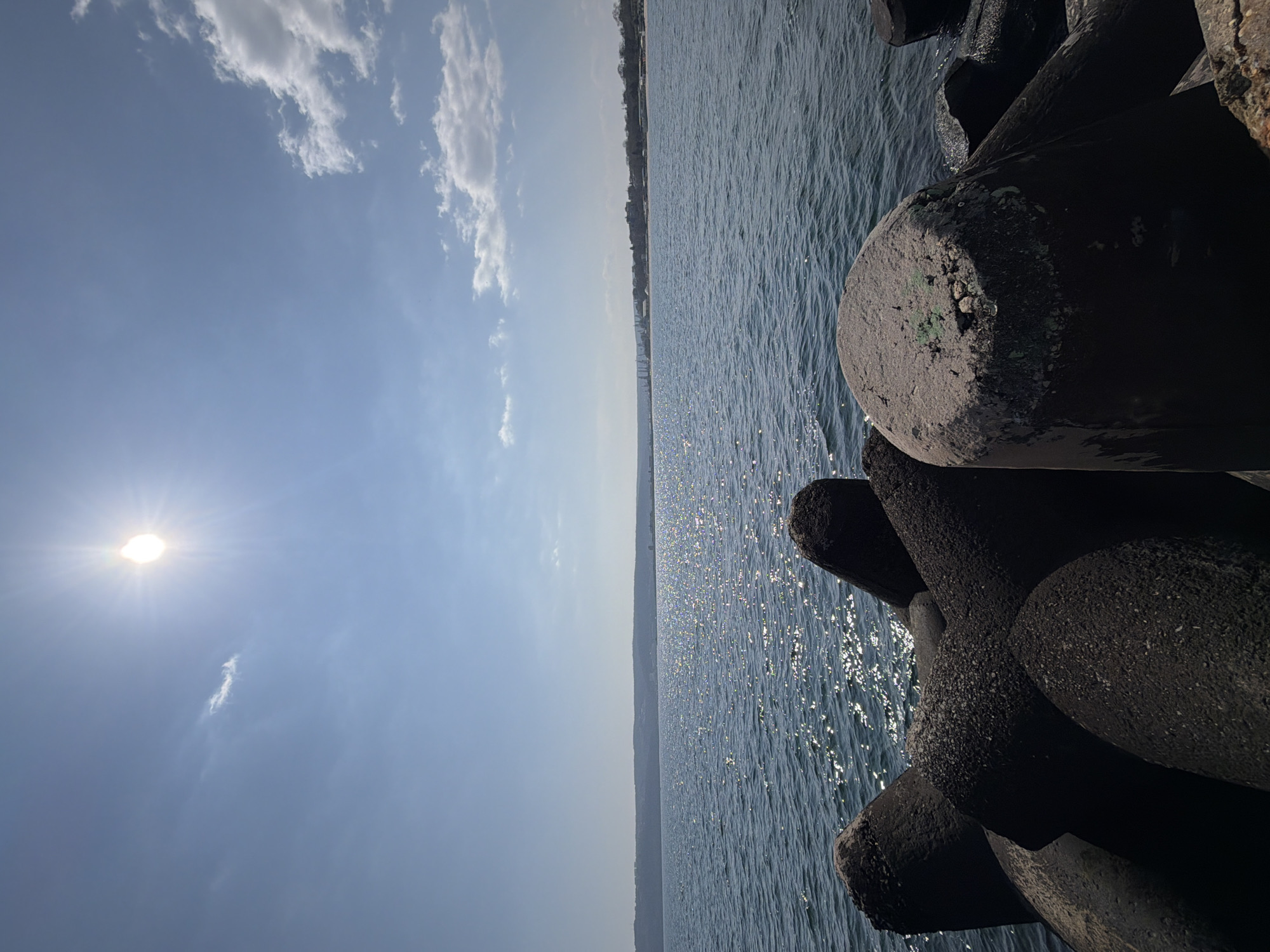 This image depicts a coastal scene on a bright, sunny day at the Black Sea, specifically in Varna, Bulgaria. In the immediate foreground, a cluster of dark grey, weathered concrete tetrapods forms a breakwater. One prominent tetrapod, slightly lighter in color due to weathering, shows a small patch of green residue, possibly moss or paint, on its flat top surface. The tetrapods exhibit a rough, granular texture. The midground is dominated by the calm, deep blue water of the sea, which reflects numerous brilliant white and yellow glints of sunlight across its rippled surface, particularly in the left half of the frame. The background reveals a distant, hazy landmass stretching across the horizon. This shoreline, consistent with the Varna coastline, features a subtle outline of structures that appear to be buildings or industrial port elements on the right, and a more natural, treed landscape on the left. The sky occupies the upper portion of the image, presenting a clear, bright blue expanse with sparse white cumulus clouds visible primarily in the upper right quadrant. The sun is prominently featured in the upper left, emitting a strong lens flare and illuminating the entire scene. No people, vehicles, or specific actions are visible within the frame.