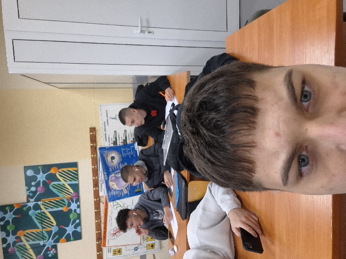 This image captures a classroom scene within an educational institution in Shumen, Bulgaria, evidenced by Cyrillic script on wall charts. In the immediate foreground, the upper portion of a male individual's face is visible, featuring light blue eyes, a straight nose bridge, and dark hair with a distinct straight fringe. This individual is the apparent photographer. Four other individuals are present. Directly behind the photographer, in the lower left, a hand wearing a light grey long-sleeved garment holds a black smartphone horizontally on a wooden desk. Three male students are seated at individual wooden desks in the mid-ground. 1. The student on the left, with dark curly hair, wears a grey hooded sweatshirt. His left hand is positioned near his ear, while his right hand holds a pen over an open notebook on the desk. 2. The central student, with a short dark buzz-cut hairstyle, wears a dark, possibly padded, jacket and white earbuds. He holds a pen over a notebook. 3. The student on the right, also with a short dark buzz-cut, wears a black hooded sweatshirt with a red logo on the chest. He holds an orange pen and writes in a notebook, his head slightly turned to the right. The classroom environment features light wooden student desks. The back wall is painted a pale yellow-beige. On the upper left wall, two large teal-colored canvases display abstract yellow DNA helices and multi-colored molecular structures. Below these, a wooden rail is mounted. Beneath the rail, several educational charts are displayed, all with Cyrillic text. A prominent blue chart depicts a detailed human eye diagram. Other charts show biological or chemical diagrams. A white, two-paneled door with a white handle is positioned on the right side of the image. The floor is light grey. Desks contain notebooks, pens, and a black laptop sleeve or case.