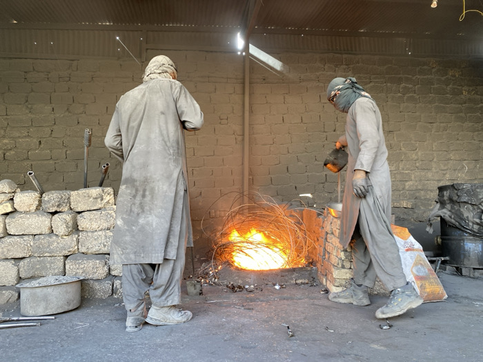 The image depicts an indoor metalworking workshop located in Shurandam, Afghanistan