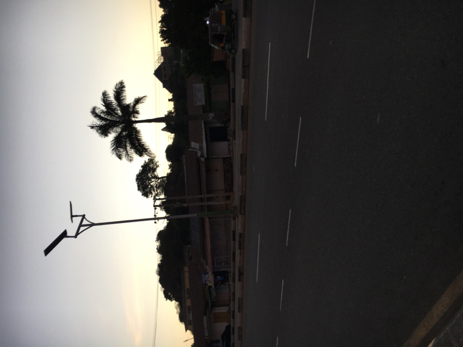 The image displays a street scene in Jos, Nigeria, at twilight