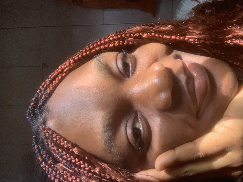 A close-up portrait depicts an individual, identified as female, with dark skin, located in Anantigha, Nigeria. The subject's face is prominently featured, illuminated by a strong, directional light source, casting bright highlights across her forehead, nose bridge, right cheek, and chin. Her hair is styled in numerous small box braids, predominantly reddish-brown with darker roots. Her left hand is positioned with fingers gently resting against her lower left cheek/jawline. The subject displays a subtle smile with slightly parted lips, and her dark eyes are open, directed towards the viewer's upper left. The background is out of focus, appearing dark with faint details of light-colored wall tiles visible in the upper right quadrant and an indistinct, darker object further right. No other individuals or clearly identifiable objects are present.