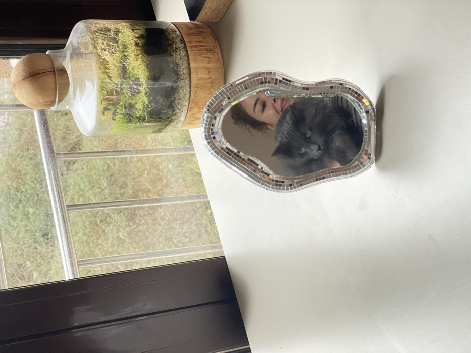 The image depicts an indoor scene set on a white, flat surface in Boreti, Montenegro. A small, irregularly shaped mirror, framed with a mosaic of reflective tiles, stands prominently in the mid-ground. Reflected within the mirror is a fluffy, medium-sized grey cat with distinct green eyes, held by an individual whose smiling face, dark curly hair, and right shoulder are partially visible behind the cat. The cat is facing forward, looking slightly towards its left. To the right of the mirror, a clear glass terrarium with a light-colored wooden base and a spherical wooden stopper contains various green mosses and small plant life over layered substrate. In the background, a window with horizontal silver bars provides a blurred view of green foliage outside, indicating an outdoor natural environment. A dark vertical frame is visible on the far left edge of the window.