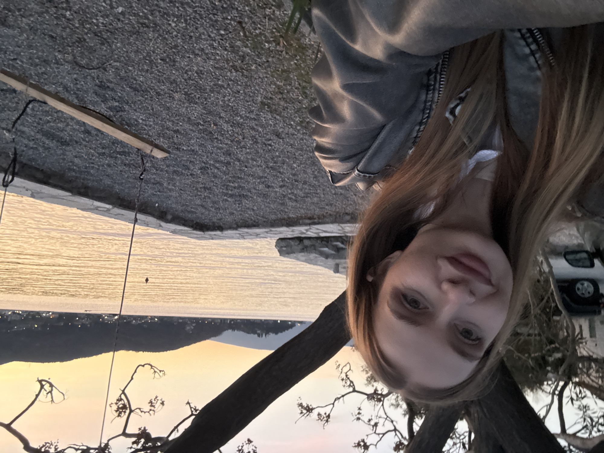 A young adult female with long, straight light-brown hair and light complexion is centered slightly to the left, taking a selfie. She wears a light-colored shirt under a grey, zippered denim jacket. Her lips are slightly pursed. She is situated on a dark grey gravel surface, which is bordered by a low, light-colored stone wall. To the right of the female, a wooden swing seat hangs from two ropes attached to a thick, gnarled tree branch that extends diagonally across the upper frame. The tree's trunk is visible on the upper left. Beyond the stone wall lies a large body of water, reflecting the golden-orange and pink hues of a sunset or dusk sky. Across the water, dark hills and mountains rise, featuring scattered artificial lights indicating a distant settlement. A small dark object, possibly a buoy, floats in the water, and a distant boat is discernible. On the far left, behind the female, a portion of a black vehicle, likely an SUV, is visible, parked on an adjacent surface. Architectural details of a building are faintly present behind the vehicle. The scene is illuminated by the warm, diffuse light of dusk, located in Lepetane, Montenegro, specifically on a waterfront area.
