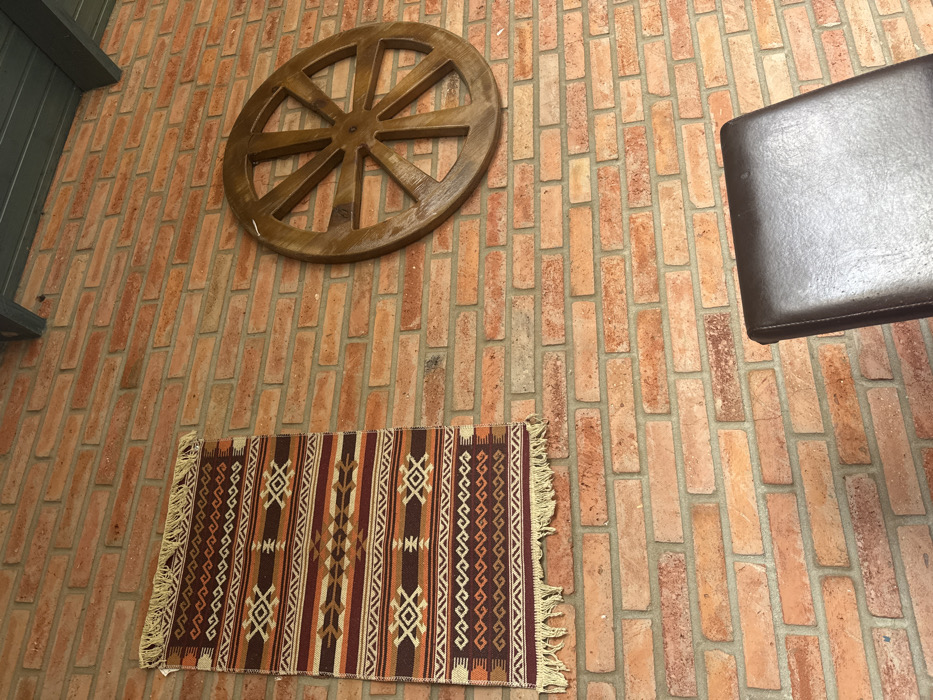 This image depicts a decorative section of a brick wall, likely part of an establishment in Uplistsikhe, Georgia. The wall is constructed from reddish-orange bricks with grey mortar joints. A rectangular tapestry or small rug, approximately one-third the width of the frame, hangs vertically on the upper-left side of the wall. It features intricate geometric patterns in shades of dark brown, orange, cream, and burgundy, with light-colored fringes at the bottom. To the right of the tapestry, a large, dark brown wooden decorative wheel, resembling a wagon wheel with spokes, is mounted centrally on the upper-right portion of the wall. In the bottom-right corner, the top portion of a dark brown, possibly leather or faux-leather, chair back is partially visible, extending upwards from the bottom edge of the frame. No individuals are present, and no actions or interactions are depicted. The ceiling structure, painted dark grey, is visible at the very top of the frame.