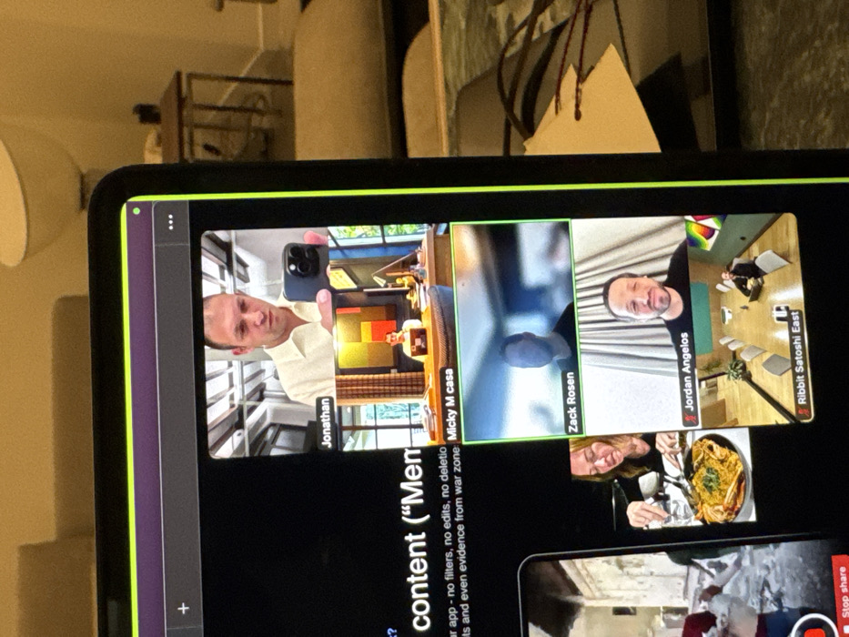 screen displaying a video conference call with multiple participants. The names of the participants visible are Jonathan, Micky M Casa, Zack Rosen, Jordan Angelos, and Ribbit Satoshi East. The call seems to be discussing content from an app with restrictions on filters, edits, and deletions, potentially dealing with sensitive information. The lower part of the screen has a "Stop share" button.