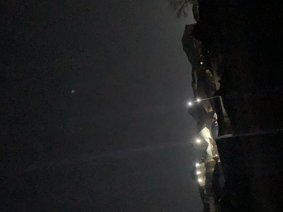 The image depicts a dark night scene. On the right, a dark structure rises, illuminated by a series of lights descending vertically. To the left, the sky is a dark, overcast gray. A small green object, possibly a light source or distant object, is visible in the upper-left portion of the sky. Overall, the image is dominated by darkness and the contrast between the lit structure and the dark sky.