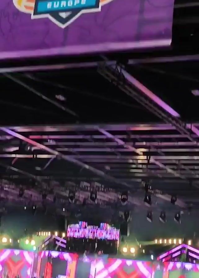 The video pans up from a stage at the Pokemon International Championship Europe event to reveal a large audience. A purple banner with the event's logo hangs from the ceiling. The stage is brightly lit with pink, white, and green lights. Large screens behind the performers display colorful graphics and text. The audience is densely packed, with people standing and looking towards the stage. The venue has a high ceiling with visible metal beams and lighting fixtures.