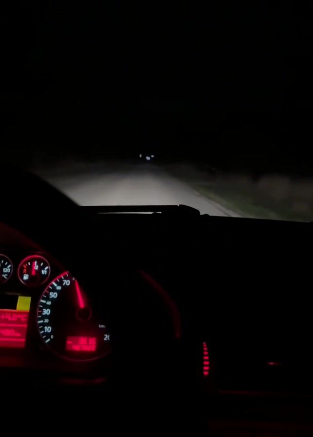 dark, in-car view of driving at night. The dashboard and speedometer are visible, illuminated in red, showing the car traveling at approximately 65 km/h. Outside, the road ahead is lit by headlights, with sparse, dark trees lining the sides. No people are discernible, and the focus is on the car's controls and the road ahead.