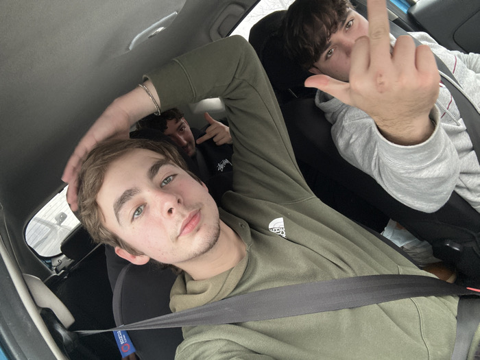 Four young men are inside a car. One person, wearing an olive green hoodie and a seatbelt, is in the foreground, taking a selfie. Behind him, another person is visible. In the back seats, two more are present. One in the back seat is making hand gestures, while the other back seat person is making an offensive gesture.