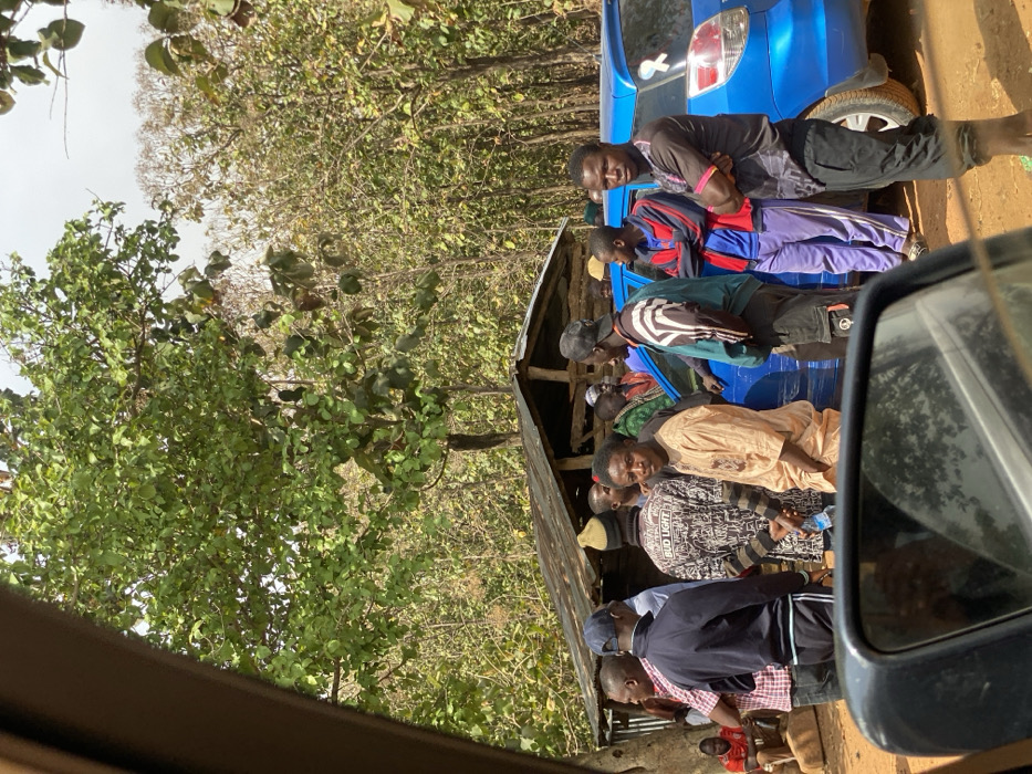 In Gidan Waya, Nigeria, a group of approximately 15 to 20 adult males is gathered outdoors amidst a wooded environment