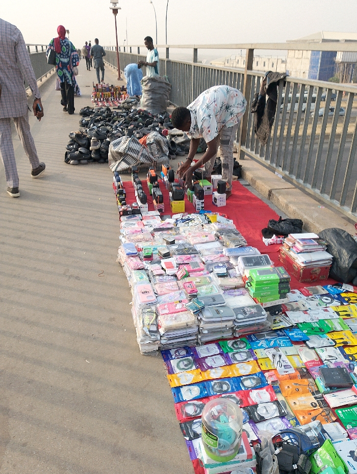 The image depicts an outdoor market scene situated on a concrete overpass or bridge in Kagini, Nigeria