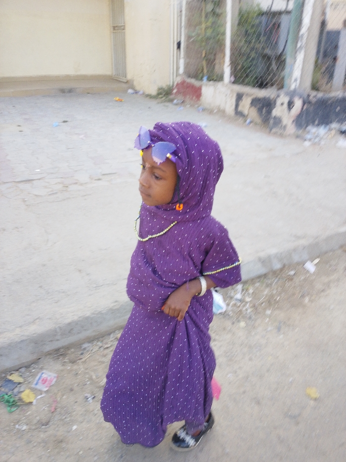The image, captured in Babban Giji, Nigeria, presents a young child standing outdoors, slightly right of center and facing left, looking forward. The child, with dark skin, wears a purple head covering and a matching purple, full-length garment, both patterned with small white dots. A pair of purple-tinted sunglasses rests pushed up on top of the head covering. A yellow/gold beaded necklace is visible around the child's neck, and a light-colored bracelet is on the right wrist. The child's right hand grasps a portion of the purple garment. Dark shoes with white details are worn on the feet. A small red mark is present on the child's forehead. The immediate ground consists of a light grey paved surface on the left and a dirt or gravel surface on the right, separated by a concrete curb. Scattered litter, including plastic bags and wrappers, is visible across the ground surfaces. In the background on the left, a plain, light-colored building with a closed metal gate is present. To the right, a chain-link fence with vegetation behind it is visible, running along a worn concrete base. The scene is illuminated by bright daylight.