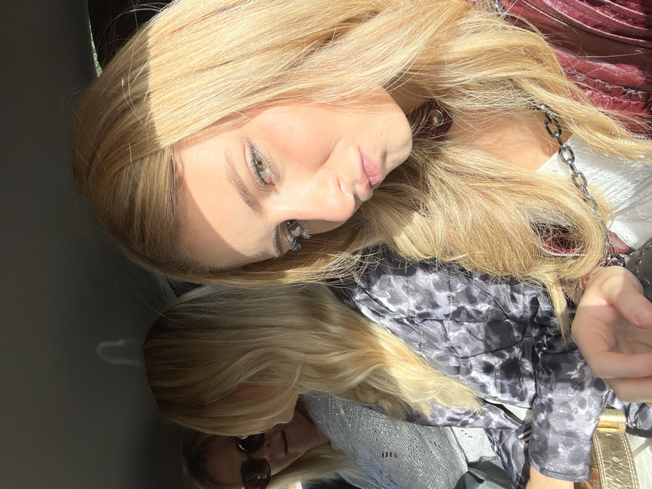 Three individuals are depicted inside a vehicle, presumably in Seville, Spain. A young adult female with long blonde hair and green eyes occupies the front passenger seat, facing the camera with a "pouty" expression, her lips pursed. She wears a white top, a dark red textured jacket, a dark choker with a gold-colored stud, and a silver-colored chain necklace. Her left hand is visible, holding a dark object, possibly studded. Strong natural sunlight illuminates her right side (viewer's left). Behind her, a second adult female with blonde hair is partially visible, wearing a dark grey patterned quilted top and largely facing away from the camera. Further back on the left, a third adult female with blonde hair wears dark sunglasses and a light-colored textured top, also partially visible and facing away from the camera. The vehicle's dark headliner is visible in the upper portion of the frame.