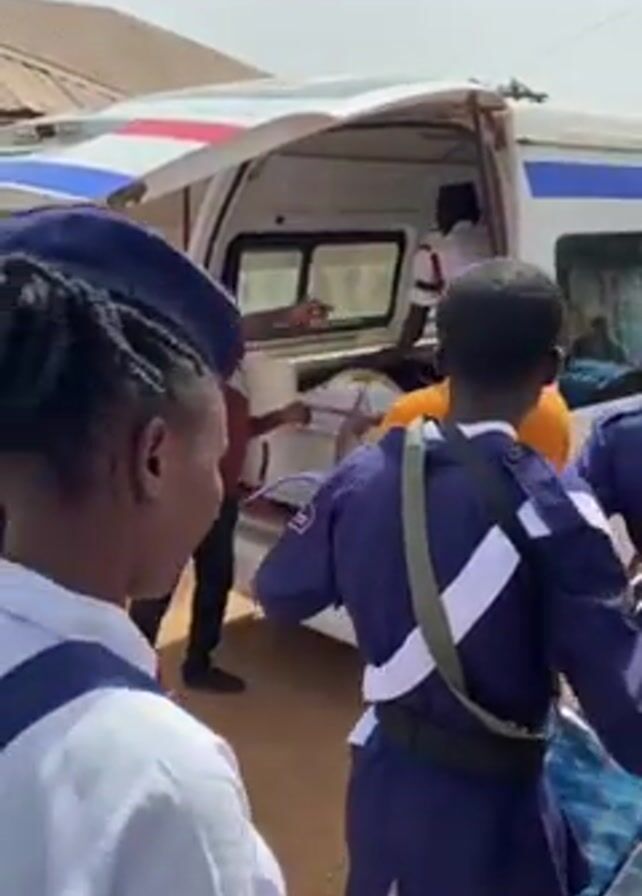 The video captures an outdoor scene centered around a white ambulance with its back doors open. A small marching band dressed in navy blue uniforms with white accents stands in front of the ambulance, presumably playing music, with several adult onlookers surrounding them. One man in a brown shirt is noticeably animated, gesturing energetically as he moves around the open back of the vehicle. Another man in an orange t-shirt and a blue baseball cap observes and captures the scene with a mobile device. The surroundings include a building with a light-colored roof and various individuals, some of whom are dressed in suits. The ground appears to be dirt or gravel. The overall impression is that of a solemn or ceremonial event.