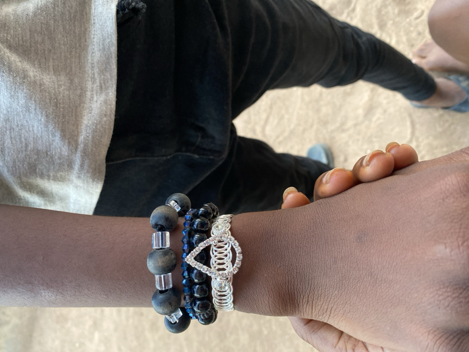 The scene is set outdoors on sandy, light-brown ground in Idiroko, Nigeria. The image focuses on two individuals, primarily showing their hands and lower bodies. In the lower left foreground, a dark-skinned hand, with fingernails exhibiting an orange-brown tint, firmly grasps the lower forearm of a second individual. This second individual, also dark-skinned, wears a stack of four bracelets on their forearm: the top bracelet features large dark beads separated by clear cylindrical beads; the second consists of small, faceted dark blue beads; the third is composed of small, dark, spherical beads; and the bottom bracelet is a wide, silver-toned cuff with a braided pattern, adorned with a teardrop-shaped element encrusted with clear stones. The second individual's attire consists of a light-colored (likely grey or off-white) t-shirt and dark-colored (likely black) pants. Their feet are visible on the ground; one foot wears a blue sandal, and the other appears bare or minimally covered.