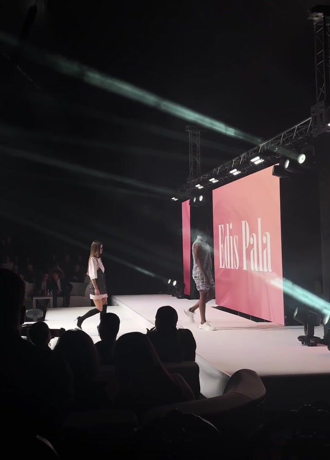 The video depicts a fashion show. Three models, two men and one woman, are walking down a runway in front of an audience. The runway is white and brightly lit, with spotlights shining across the stage. Behind the runway is a large screen displaying the name "Edis Pala." The woman is wearing a white top, black skirt, and black boots. One man is wearing a light-colored patterned outfit and white shoes, and the other man is wearing a shirt, pants, and casual shoes. The audience is silhouetted in the foreground.