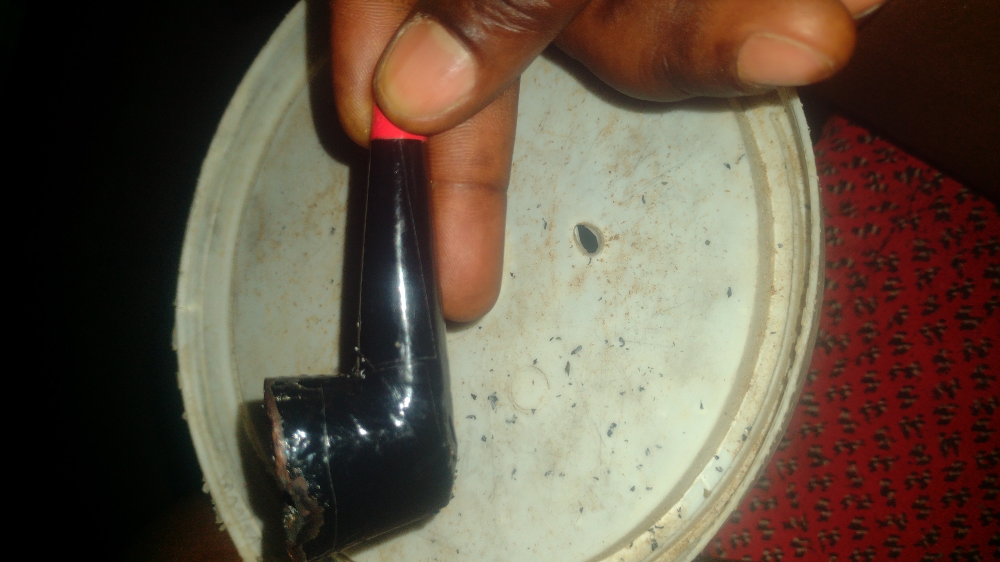 A close-up shot shows a dark-skinned hand holding a black pipe with a red tip. The pipe rests on a white, circular, slightly dirty lid. The background is divided between a dark, unlit area and a red surface patterned with dark shapes. The image likely originates from Jos, Nigeria, based on contextual cues (not visible in the image).