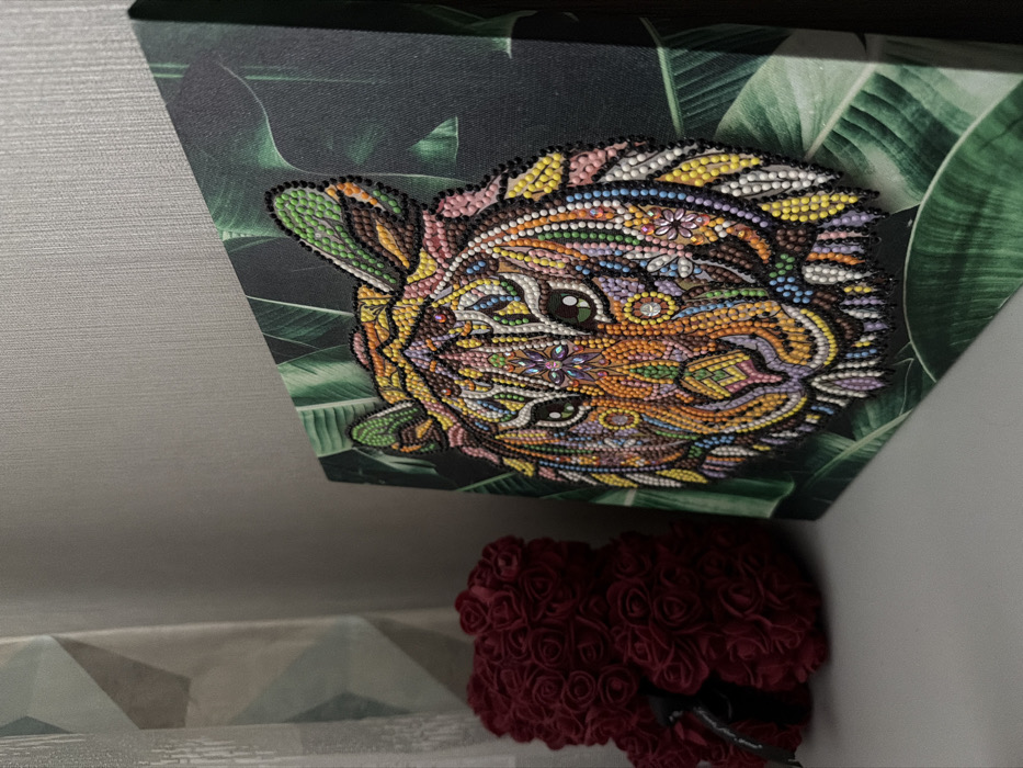 This indoor scene, located in Sofia, Bulgaria, displays two decorative objects on a light-colored surface. A rectangular canvas print on the right features a vibrant, stylized tiger head composed of multi-colored mosaic beads or rhinestones, set against a dark green banana leaf pattern. The tiger's features include hues of orange, yellow, green, pink, purple, white, brown, and black, with sparkling accents in the eyes and facial patterns. To the left, a red teddy bear figure, approximately half the canvas's height, is constructed from densely packed artificial red roses and adorned with a black ribbon around its neck. The background wall is covered with light-colored wallpaper, exhibiting a geometric pattern with diagonal lines on the left side. Illumination from the upper left casts soft shadows across the scene.