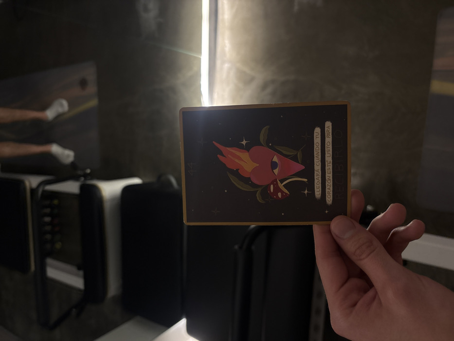 A hand holds a tarot-style card with a gold border. The card's background is dark, featuring a red heart with an eye, sprouting flames, and accompanied by mushrooms and leaves. Small stars are scattered around the illustration. Vertical Spanish text reads, "Llegará cuando tu corazón este listo para recibirl." The background shows an out-of-focus interior with exercise equipment and a strip of light.