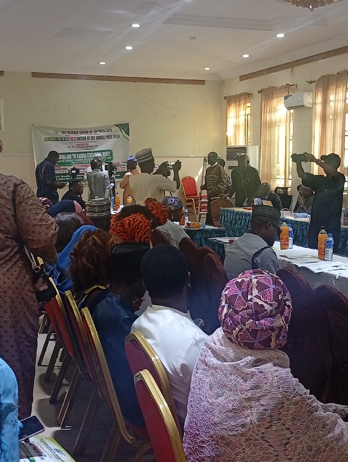 An indoor conference room in Unguwar Sarki, Nigeria, hosts a gathering identified by a large banner as "THE NIGERIA UNION OF JOURNALISTS 2023 EDITION OF THE ANNUAL PRESS WEEK," with a thematic focus on "MEDIA AND THE KADUNA STATE PEACE MODEL