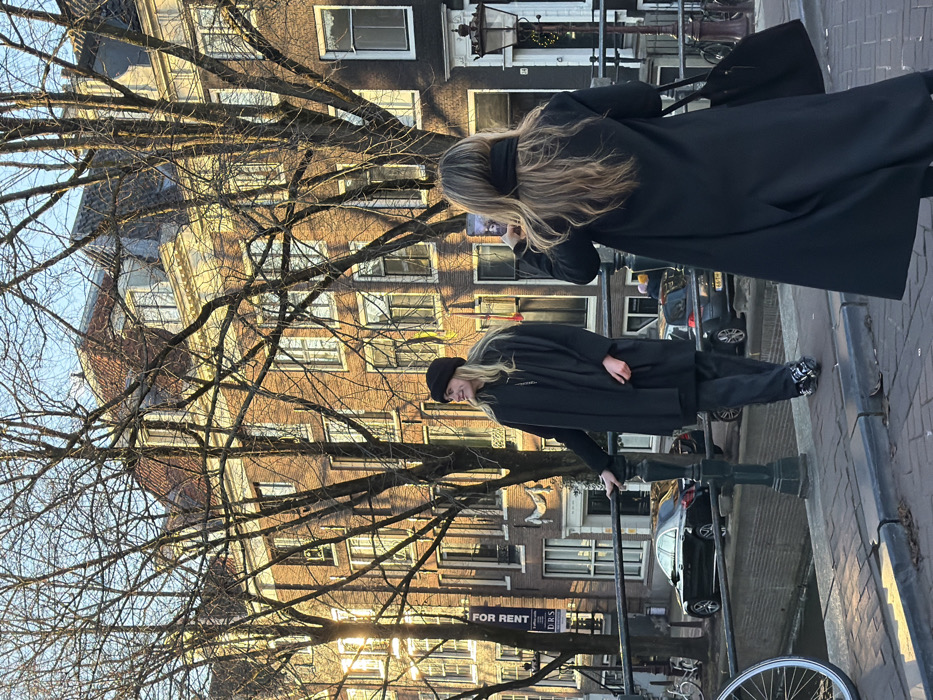 The image depicts two females on a stone and metal bridge in Amsterdam, Netherlands, during daylight with warm, low-angle sunlight