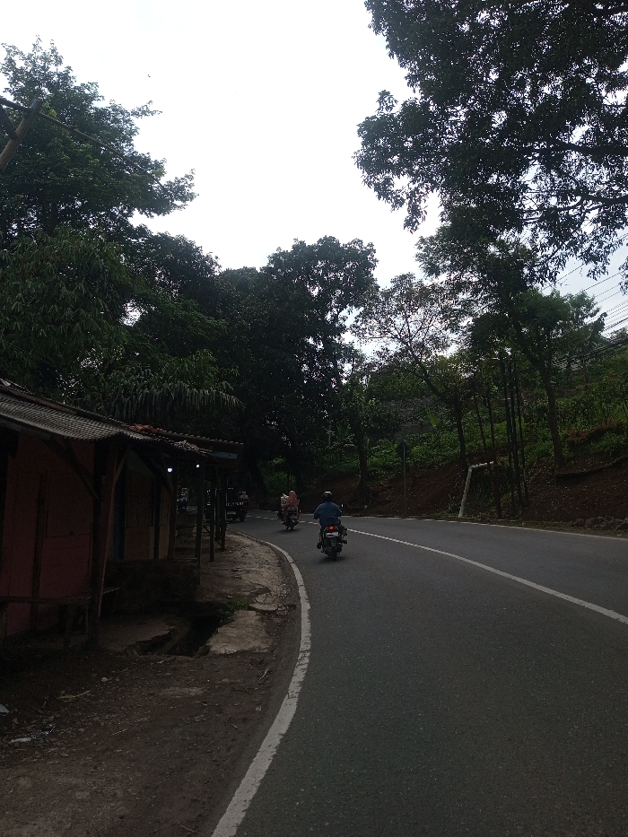 The image depicts a rural or semi-urban road scene in Chhenangri_Rishor, Bhutan. The scene is dominated by a dark asphalt road curving gently to the right, bordered by a solid white line on its left edge. On the road, three vehicles are visible, all appearing to be motorcycles, moving away from the viewer. The closest motorcycle has a single rider wearing a blue shirt. Behind it, a second motorcycle carries two individuals; one appears to be wearing a light-colored garment with a pink or reddish head covering. A third, darker vehicle is partially obscured further down the road, also moving in the same direction. To the left of the road, a dirt and gravel shoulder separates the asphalt from a simple, single-story structure. This building features a reddish-brown exterior and a dark, corrugated metal roof supported by wooden posts. An open drainage ditch or culvert is visible in the ground between the road and the building. Dense green foliage and trees line the area behind the structure. To the right of the road, a steep hillside rises, covered with lush, dark green trees and undergrowth. Patches of exposed reddish-brown soil are visible on the slope. Utility poles or similar vertical structures are partially obscured within the foliage. The sky is bright and overcast, indicating daytime conditions. Large, dark green tree canopies frame the upper left and right portions of the image, contributing to a shaded appearance in parts of the scene.