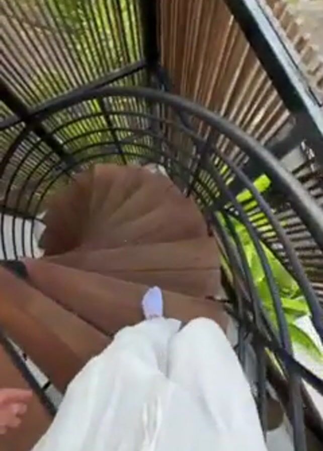 first-person perspective of someone walking down a spiral staircase. The staircase has wooden steps and a black metal railing. The person is wearing white pants and light purple socks. The staircase is enclosed in a structure with wooden slats for a ceiling. Green plants can be seen outside the structure. The person is walking slowly and carefully down the stairs.