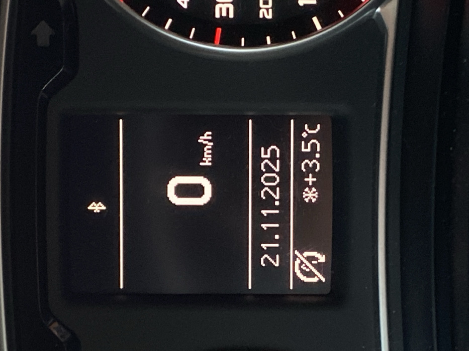 The image displays a close-up, front-on view of a vehicle's digital instrument cluster and a partial adjacent analog dial, positioned within a vehicle in Tourcoing, France. The illuminated digital screen, featuring white text and symbols against a dark background, provides multiple data points. A Bluetooth symbol is visible in the upper section. Below a horizontal divider, "0 km/h" is prominently displayed, indicating the vehicle's stationary status. A second horizontal divider separates this from the lower section, which shows the date "21.11.2025". Below the date, a circular symbol with a diagonal line (often signifying 'off' or 'inactive') is positioned next to "*+3.5°C", indicating the ambient temperature. To the right of the digital display, a portion of an analog gauge with red numbering, including "10," "20," "30," and "40," is visible, likely representing a speedometer or tachometer. The entire assembly is set into a dark, textured dashboard material.