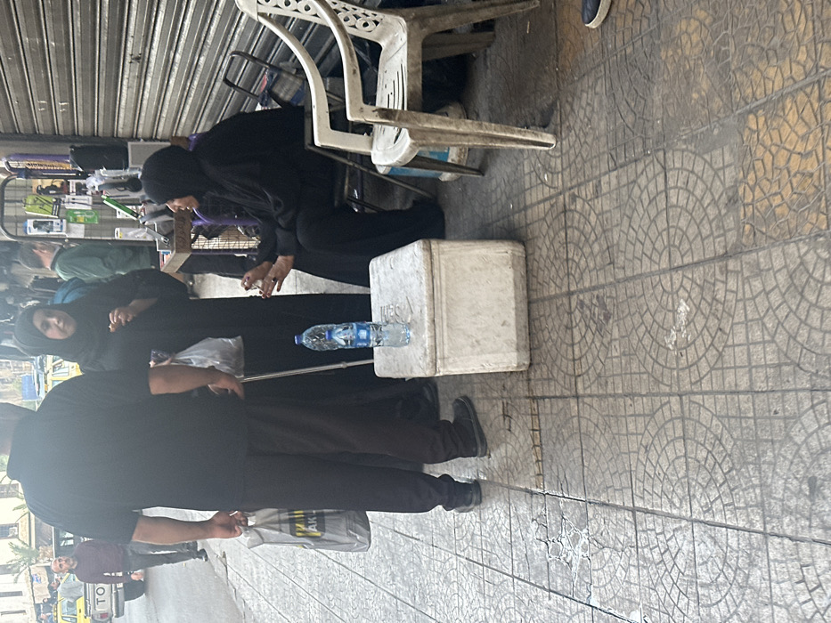 The image captures a street scene in Al-Qanawat Municipality, Syria. On a tiled sidewalk, two individuals stand while one is seated. A male subject, wearing a black short-sleeved shirt and black trousers, stands with his back partially to the viewer, holding a white plastic shopping bag. To his right, a female subject in a black abaya and hijab stands, bringing a small item to her mouth. A walking stick is visible near her lower body. To the right of the standing figures, another female subject, also in a black abaya and hijab, is seated on a dark metal folding chair, facing the standing individuals. Her hands are visible, displaying red nail polish and rings. Centered on the pavement in the mid-ground is a white, rectangular cooler with a lid, upon which a plastic water bottle with a blue label rests upright. To the right of the cooler, an empty, dirty white plastic chair with a decorative backrest is positioned. The pavement itself features a grey and white tiled pattern of concentric circles within a square grid, showing signs of wear and dirt. In the background to the left, a street is visible with a light-colored pickup truck and a yellow taxi. A male pedestrian in a maroon shirt walks on the sidewalk behind the truck. The background to the right shows a commercial frontage with a partially rolled-up metal security shutter and merchandise displayed on racks, suggesting a street vendor or small shop. Another male figure in a green shirt is partially visible behind the standing female, near the shop. The scene is illuminated by diffuse daylight.