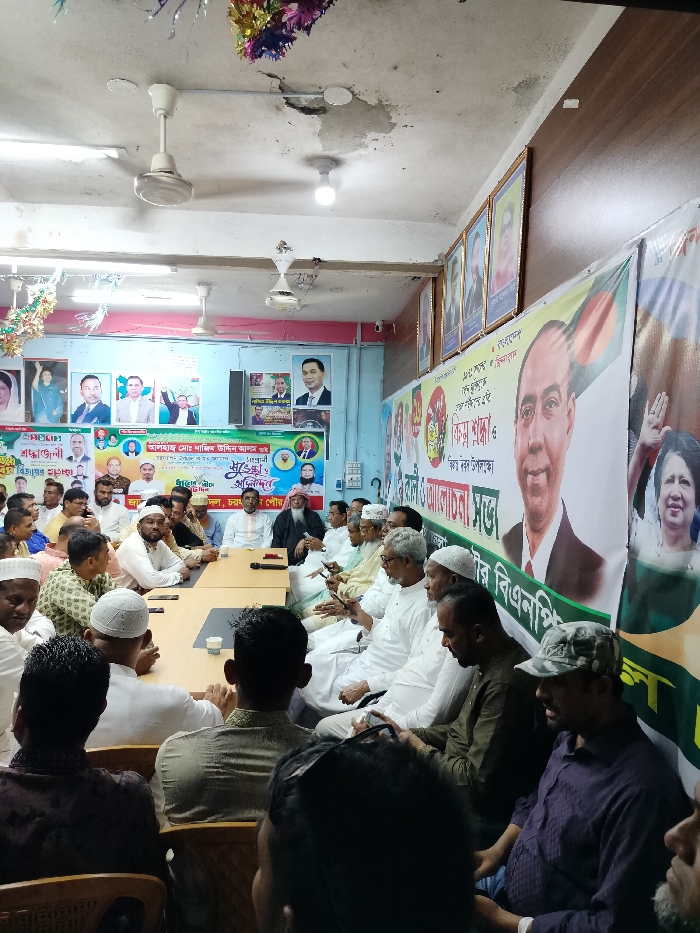 group of men gathered in a room in Charfasson Sadar, Bangladesh (latitude: 22.187, longitude: 90.76). The room is sparsely furnished, with a long table at the center where several men are seated. There are framed pictures on the walls, and large political posters featuring men and women in traditional clothing, along with Bengali text. There are ceiling fans in the room. The men are wearing traditional Islamic clothing, with some wearing white shalwar kameez and others wearing a combination of shirts and pants. They are engaged in conversation and some are using mobile phones. The room has a wooden floor and is lit by fluorescent lights. The overall environment is casual and informal, suggesting a community gathering or meeting.