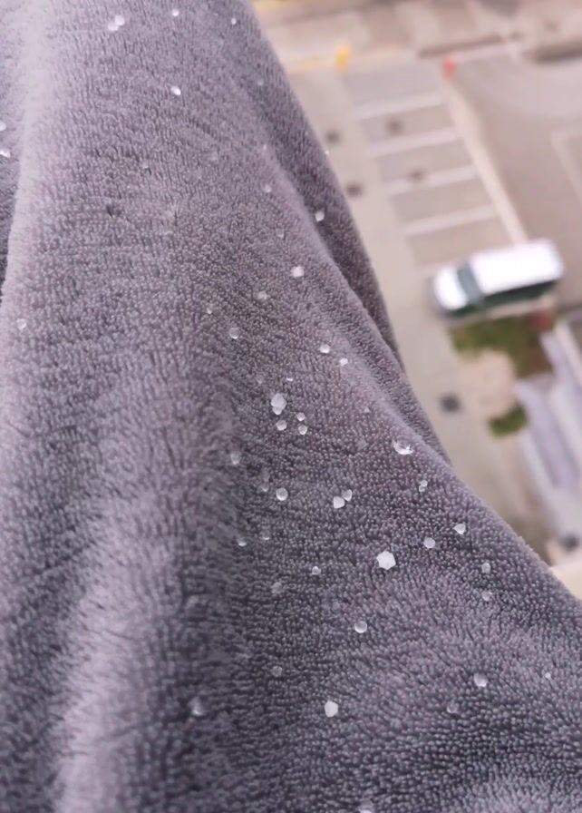 The video begins with a close-up shot of a gray, textured garment, such as a sweatshirt sleeve, covered in small, white, translucent objects that resemble hailstones