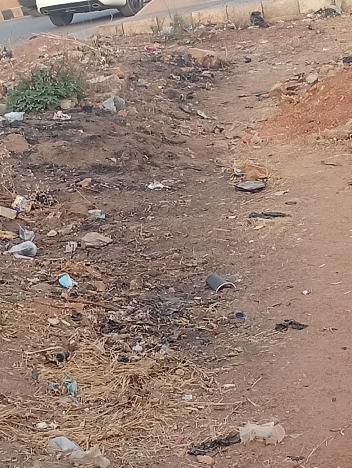 A roadside area is littered with trash. The ground is a mix of dirt, straw, and burnt patches. Various plastic containers, paper scraps, and miscellaneous debris are scattered around. A small patch of greenery is visible at the edge of the road. A white car's rear is partially visible in the upper left corner of the frame. A mound of reddish dirt or earth sits on the right side of the frame.