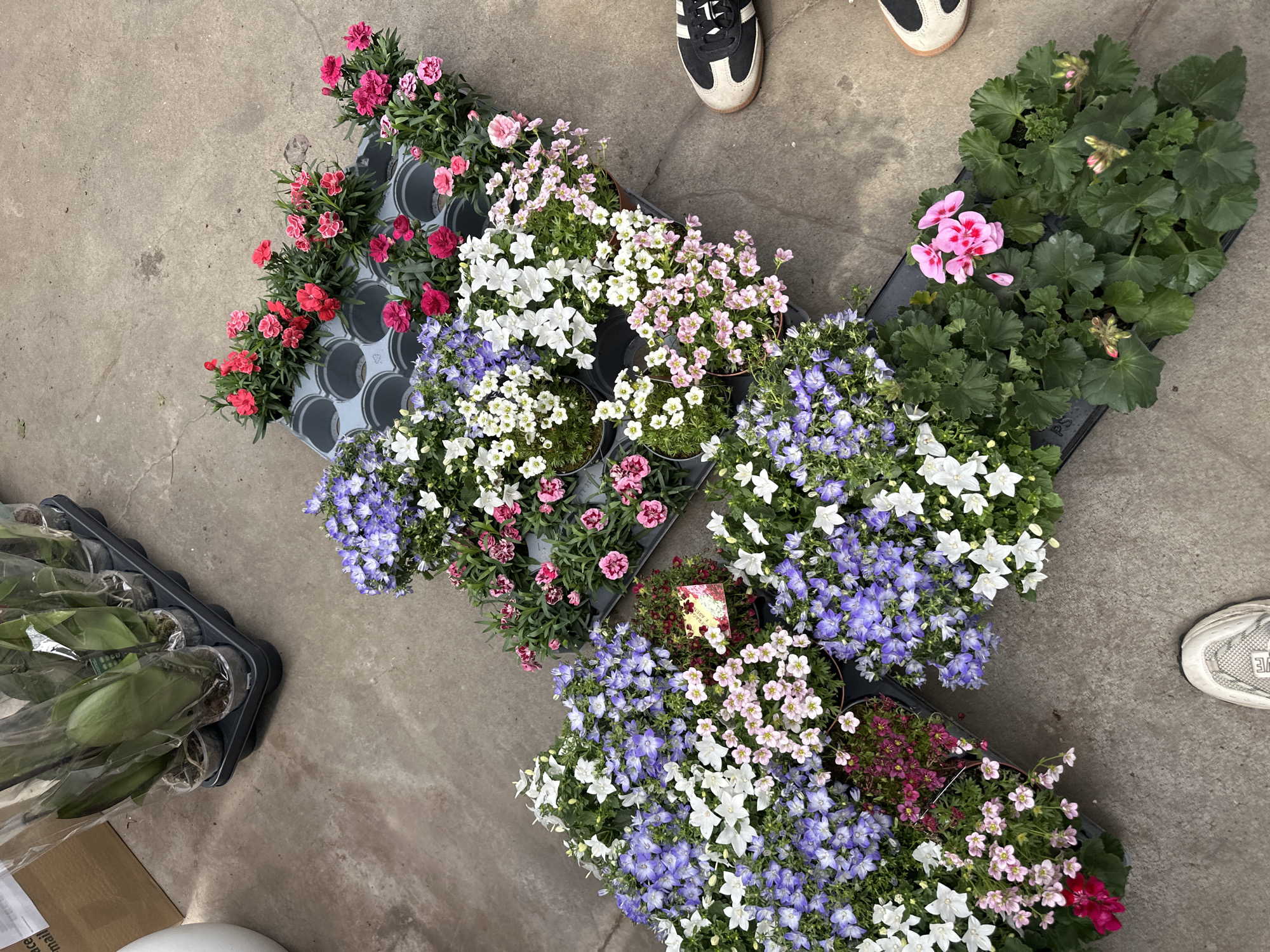 The image depicts an overhead view of a diverse retail display of potted flowering plants arranged on a concrete floor, likely within a garden center or a supermarket's garden section inside a shopping mall in Sofia, Bulgaria. The foreground and midground are dominated by numerous plants in black plastic trays. Visible plant types include: * Large clusters of white and purple campanula (bellflowers). * Groups of pink and red dianthus (carnations/pinks) with variegated petals, some in individual pots within multi-cell trays. * Smaller pots of pink-flowered saxifraga (rockfoil). * A tray containing pink geraniums (pelargonium) with lush green foliage and several blooming flowers, along with developing flower buds. In the upper left background, a black plastic tray holds several potted orchids (Phalaenopsis) with green leaves, individually wrapped in clear plastic sleeves. Partially visible next to the orchids is a brown cardboard box with the word "MALL" printed on its side. The concrete floor appears light grey and shows some minor imperfections and scuff marks. Two individuals' feet are partially visible, indicating their presence and interaction with the display. The upper right shows the front portion of a black sneaker with white stripes and a beige toe cap. The lower left shows the front portion of a white or light grey mesh sneaker. A small red price or information tag is visible among some of the plants.