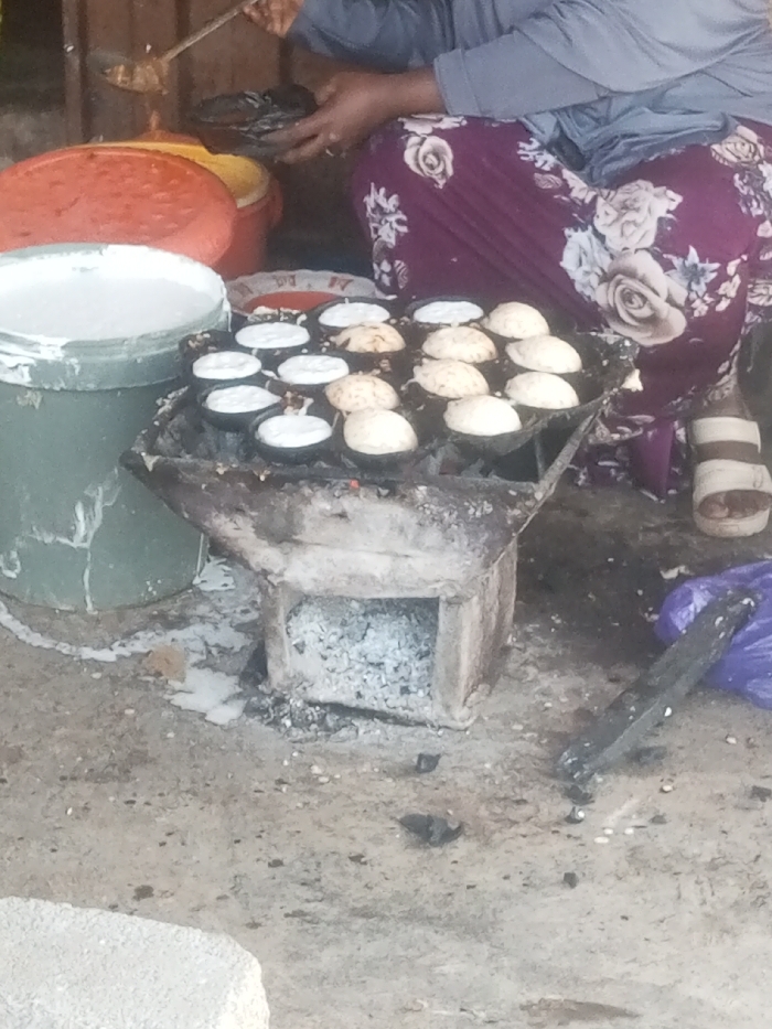 A person with floral pants cooks small cakes on a grill over a charcoal stove. A bucket of batter sits next to the grill, as does a smaller container with an orange lid. The person uses a ladle to prepare the cakes. The cakes are round, white, and brown. Some are cooking and some are ready. A piece of wood lies on the floor near the stove.