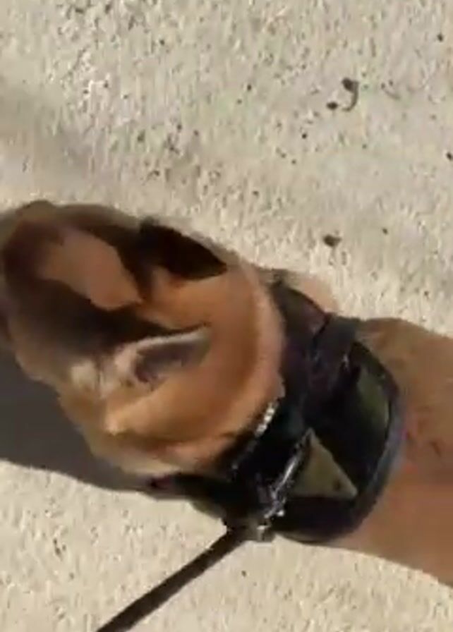 small dog walking on a concrete surface on a leash. The dog is brown with a white tail and is wearing a black harness. The camera angle is high, looking down at the dog. The dog is walking away from the camera. A shadow is cast on the concrete.