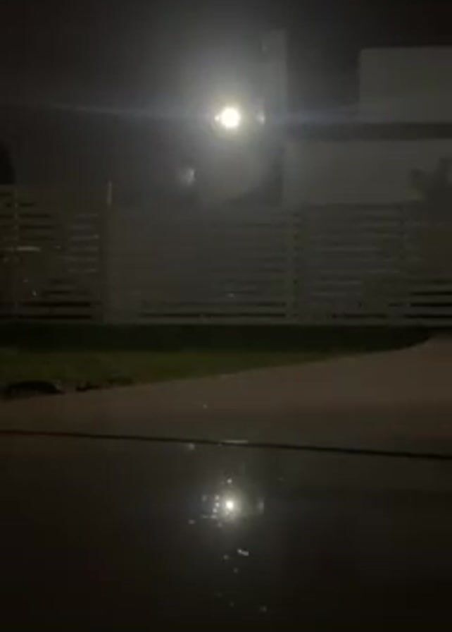 dark, rainy night scene in front of a house. Raindrops are visible, reflecting the light from a bright outdoor spotlight. The house has a white fence, and the ground is wet with puddles reflecting the light. There is some green grass visible as well. The camera appears to be stationary and at a low angle.