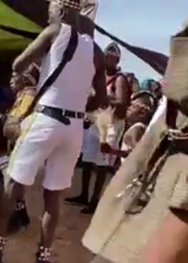 A group of people are participating in a cultural celebration outdoors. The event appears to be festive, with music and dancing. Several men are playing drums and flutes, while others, including a young boy in a yellow outfit, are dancing. The dancers are wearing white tank tops and shorts with colorful decorations. A crowd of people watches from under a tent. The ground appears to be dirt or sand.
