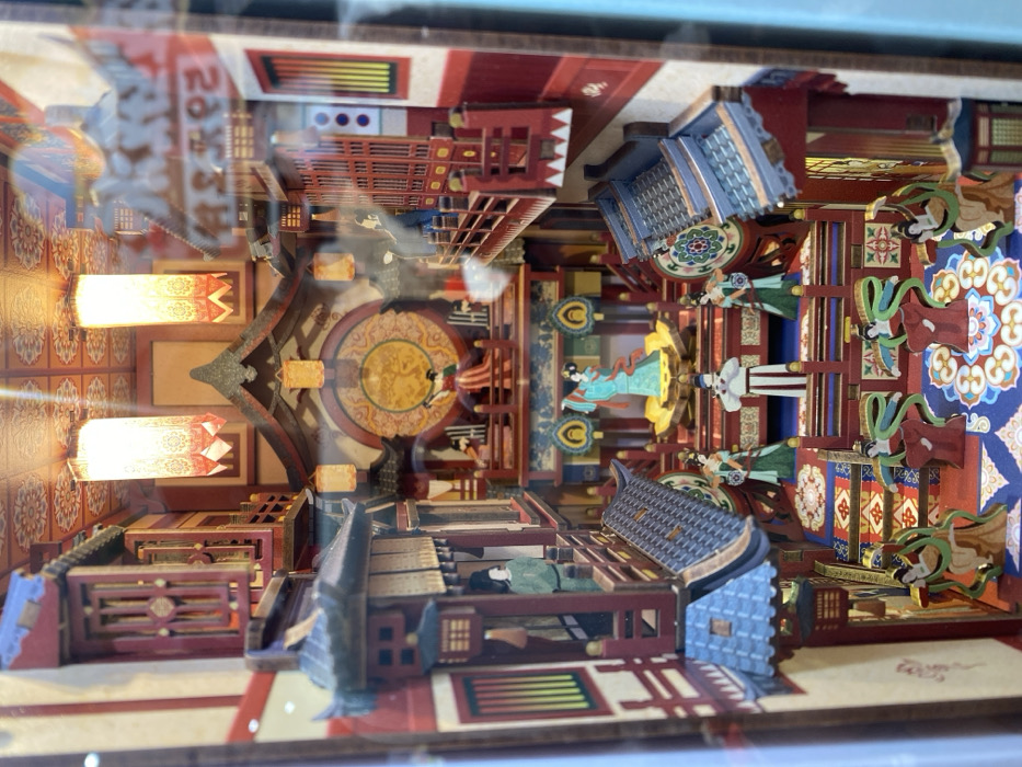The image displays an illuminated, multi-level miniature diorama, representing a traditional Chinese architectural complex