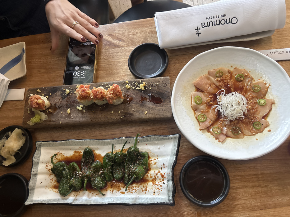 This overhead image depicts a dining table at the Onomura Nigiri Room, a restaurant located in the Roma Norte neighborhood of Mexico City. The table is light-colored wood. On the table, from left to right: - A small black bowl containing a dark liquid is positioned at the top left, alongside another small black bowl holding pickled ginger. - Below these, a rectangular white plate holds eight charred green peppers, drizzled with a reddish-brown sauce and sprinkled with white flakes. - To the right, a rectangular wooden board features four pieces of crispy rice sushi topped with diced red fish and yellow crumbs; one piece is missing, and sauce drippings are visible on the board, which is engraved with the "Onomura" logo. - A black smartphone lies face-up, displaying "3:30" and "Wednesday, 17 October" on its screen, with a faint reflection of a face. - A person's right hand, with dark red nail polish and a gold ring on the ring finger, rests near the smartphone. - Below the wooden board, a small empty black bowl is present. - At the bottom left, another small black bowl contains a dark liquid. - A large round white plate in the center displays thin slices of light-colored fish carpaccio, each garnished with a green chili slice and fried garlic/onion bits, all covered in a light brown sauce. A mound of shredded white vegetable is in the center. - A folded white napkin, emblazoned with "Onomura + Nigiri Room," is positioned at the bottom right.