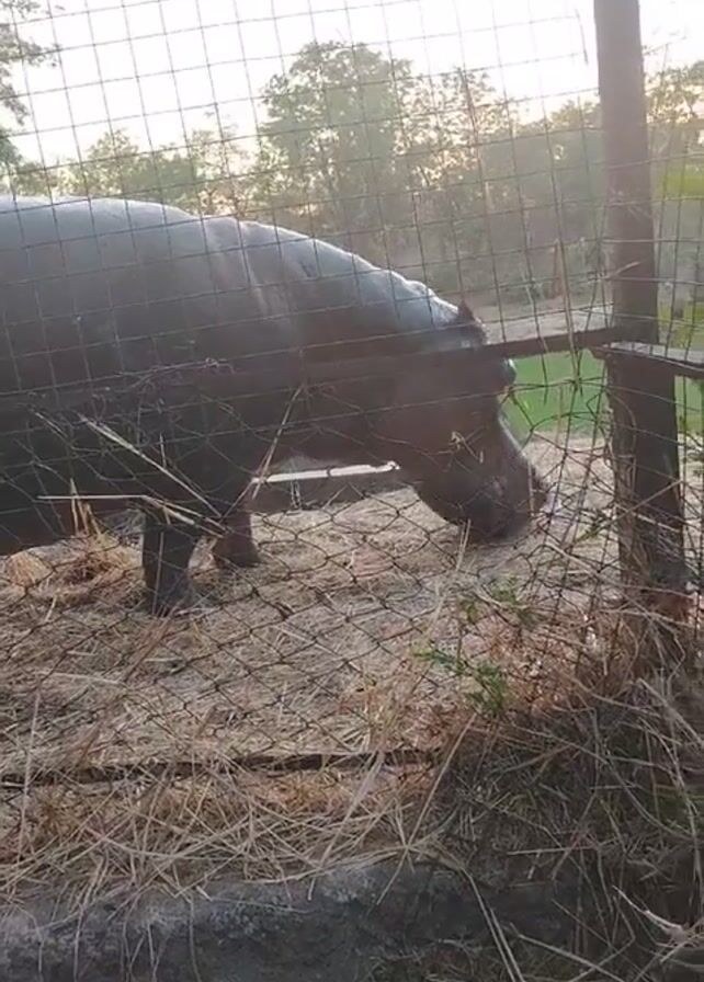 hippopotamus in an enclosure at what appears to be a zoo or wildlife park. The hippo is inside a fenced area, standing on a ground covered with dry grass and straw. It is reaching through the fence, seemingly trying to grab grass or vegetation from outside the enclosure. The background includes trees and the sky, which indicates an outdoor setting. The lighting is somewhat bright, possibly due to the time of day when the video was taken. The fence is made of wire mesh.